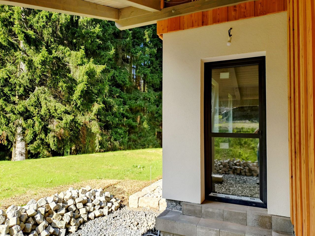 Obvodové zdivo Heluz 2in1s polystyrenovou výplní. Pohledový trámový strop. Vázaný pohledový krov z KVH hranolů s nadkrokevní PIR izolací a palubkovým záklopem. Dubové schodiště. Vnější dveře a okna Rehau s trojsklem. Hliníková střešní krytina Prefa. Teplovodní podlahové topení. Krbový modul Schiedel Kingfire Parat. Bezklíčové otevírání vstupních dveří a garážových vrat, zabezpečovací systém, domovní telefon. Chytrá domácnost přes mobilní telefon. Fasádní prvky z modřínového dřeva a přírodní žuly. Venkovní zpevněné plochy ze žulových kostek. Terénní úpravy včetně travního osevu.
